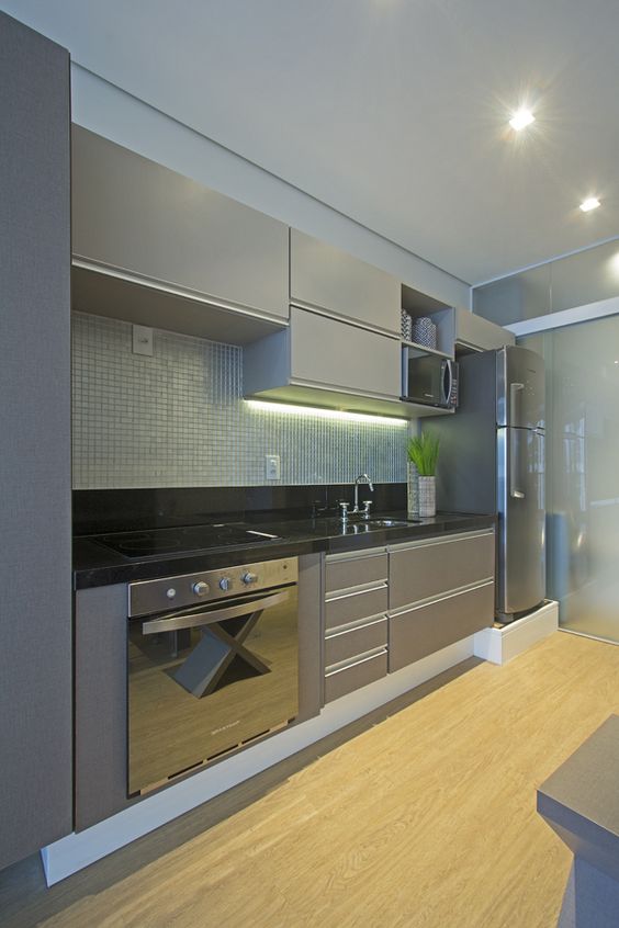6. Cozinha integrada a uma área de serviço “escondida” atrás de uma armário suspenso